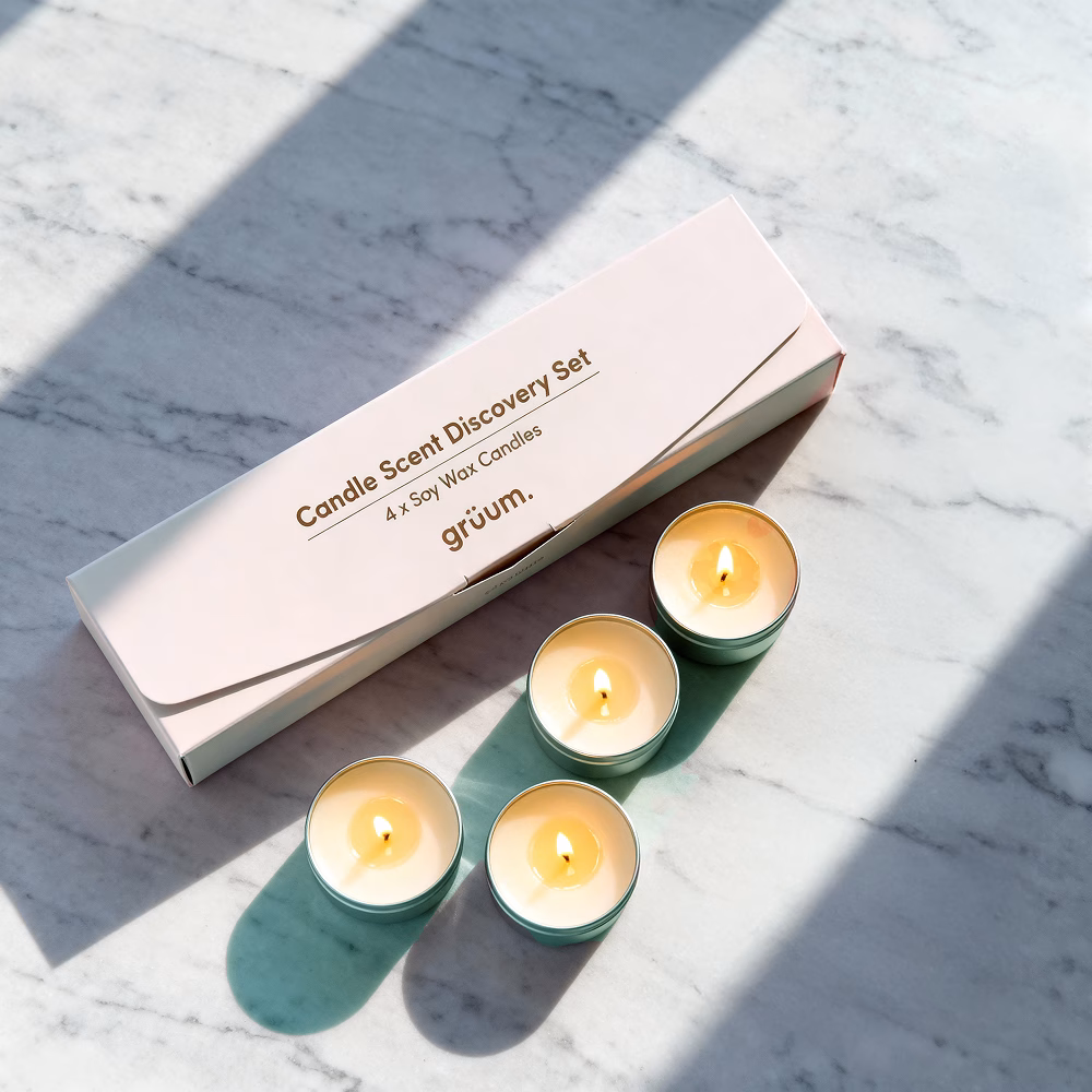 - Choose 4 scents from a collection of 9 unique blends. A playful way to explore, compare, and discover the aromas that truly light you up before committing to a larger candle.